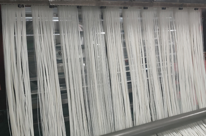 工藝流程:大米混配--加淀粉--粉碎/磨漿--調(diào)漿--熟化--擠絲--散絲攤薄--切斷--掛桿--老化--松絲--成品